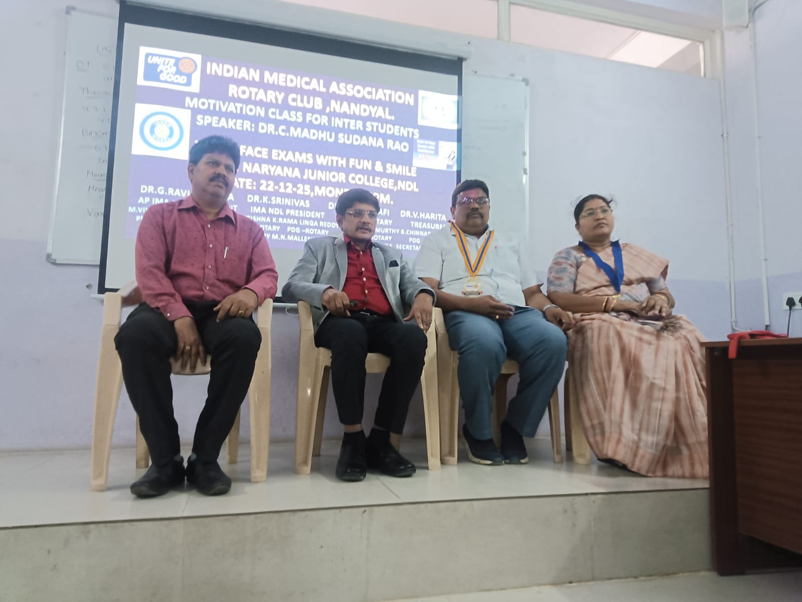 నంద్యాల రోటరీ క్లబ్, ఇండియన్ మెడికల్ అసోసియేషన్ నంద్యాల మరియు ఇన్నర్ వీల్ క్లబ్ వారి ఆధ్వర్యంలో నారాయణ జూనియర్ కాలేజీ విద్యార్థులకు మోటివేషన్ క్లాస్ పట్టణంలోని శోబాలాడ్జి సమీపంలోని నారాయణ జూనియర్ కళాశాలలో నిర్వహించారు…